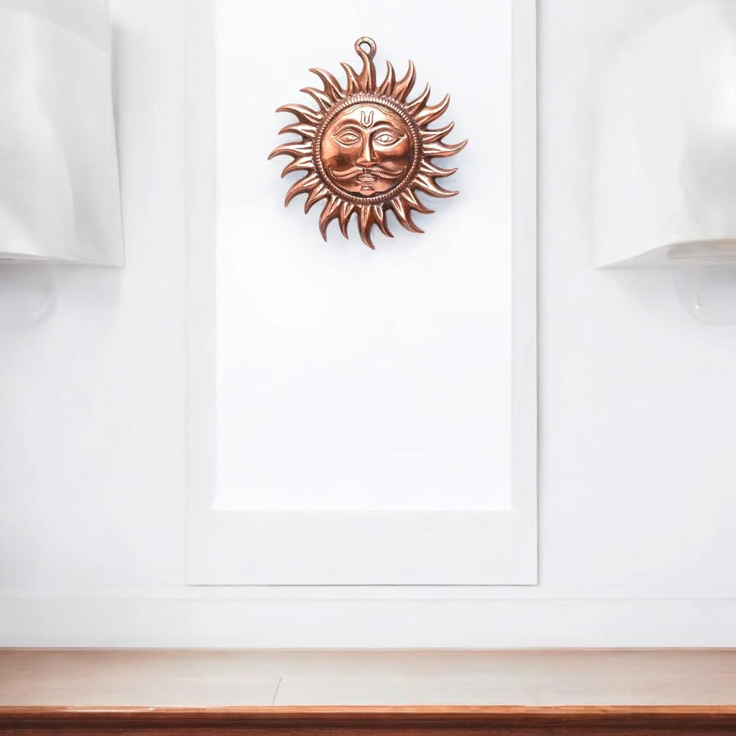Invite positive energy, prosperity, and divine blessings into your home with the BHAKTI SHRINGAR Metal Copper Sun Face Wall Hanging. This Shri Surya Narayan idol, crafted from pure copper, symbolizes power, wisdom, and success, making it a perfect addition to your home, office, temple, or meditation space. According to Vastu Shastra and Feng Shui, the Sun God represents strength, positivity, and abundance, bringing good luck, financial stability, and success. Place this exquisite Surya wall hanging in the east direction to harness the powerful energy of the rising sun, enhancing peace, harmony, and prosperity in your space.