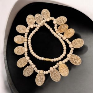 This exquisite Tulsi Hare Rama Hare Krishna Mahamantra 16 Tulsi Locket Kanthi is a unique spiritual accessory that combines traditional craftsmanship with profound spiritual significance. Carefully handcrafted in the sacred town of Vrindavan, each locket is made with 16 natural Tulsi beads that are ethically sourced and meticulously shaped into an antique oval shape. The beads are known for their deep connection to Hindu spirituality, especially in devotion to Lord Rama and Lord Krishna. The Kanthi (necklace) features a handmade, neutral Tulsi finish, making it perfect for daily wear or as a cherished gift for spiritual seekers. This locket serves not only as an ornament but also as a tool for meditation and prayer, with the sacred Hare Rama Hare Krishna Mahamantra engraved, allowing the wearer to carry divine blessings and vibrations throughout the day.