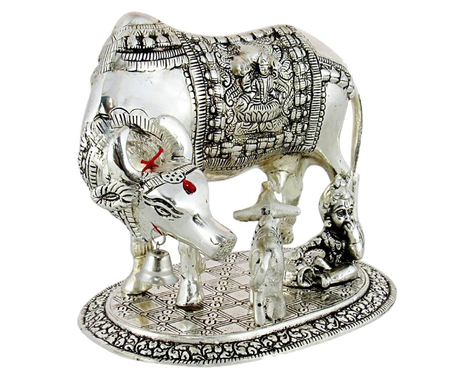 - DESIGN: Beautifully crafted metal Kamdhenu cow with calf and Gopal idol showpiece with an elegant silver finish